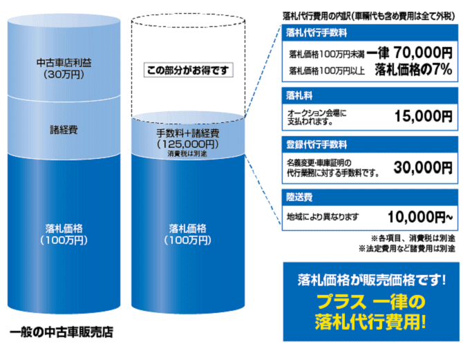 当社では、カーオークションの代行を致します。 オークションから厳選された優良中古車を落札させて頂きます。(ランクB以上のお車を選んでおります) 全国のオークション会場から豊富な在庫よりご希望のお車をおお探ししますので、 お客様のリクエストに応じた車両をご提供させて頂きます。 1.オークションのシステム ![]() 2.オークションで車のご購入とは? ![]() 3.費用の内訳 ![]() 4.オークションの特徴 ![]() ![]() 5.ご購入の流れ ![]() ※ オークション会場での現車の下見は、代行者を派遣して確認をしております。 場合によっては、落札しない場合も御座います。 |